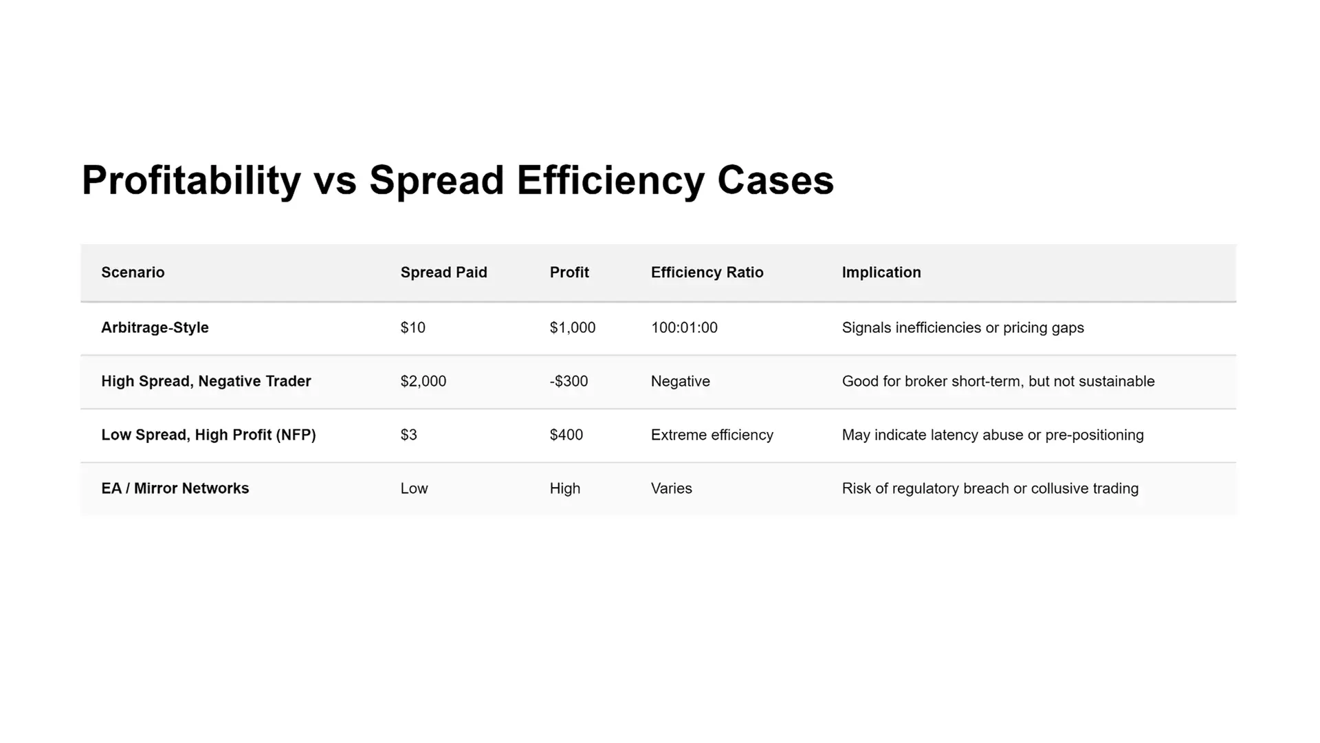 - A trader achieving a $10 spread with $1,000 profit creates a 100:1 ratio – an extraordinary efficiency that suggests possible arbitrage opportunities or flawed execution exposure on your end.