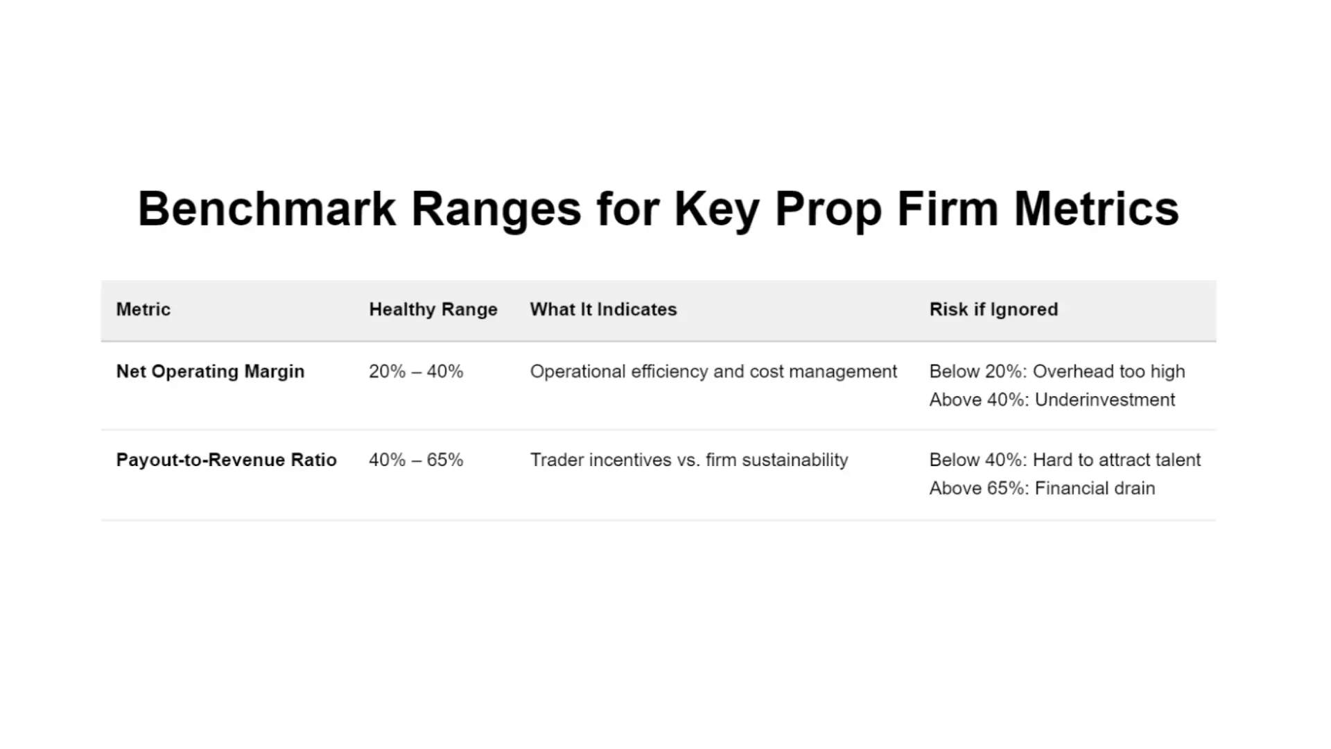 - Net Operating Margin (20–40%) reflects how efficiently your prop firm runs.