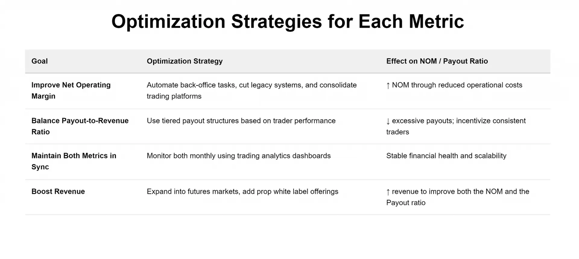 - Invest in Talent and Tech: Attract advanced traders with competitive profit sharing and equip them with cutting-edge trading platforms to boost revenue, improving both NOM and payout ratios.